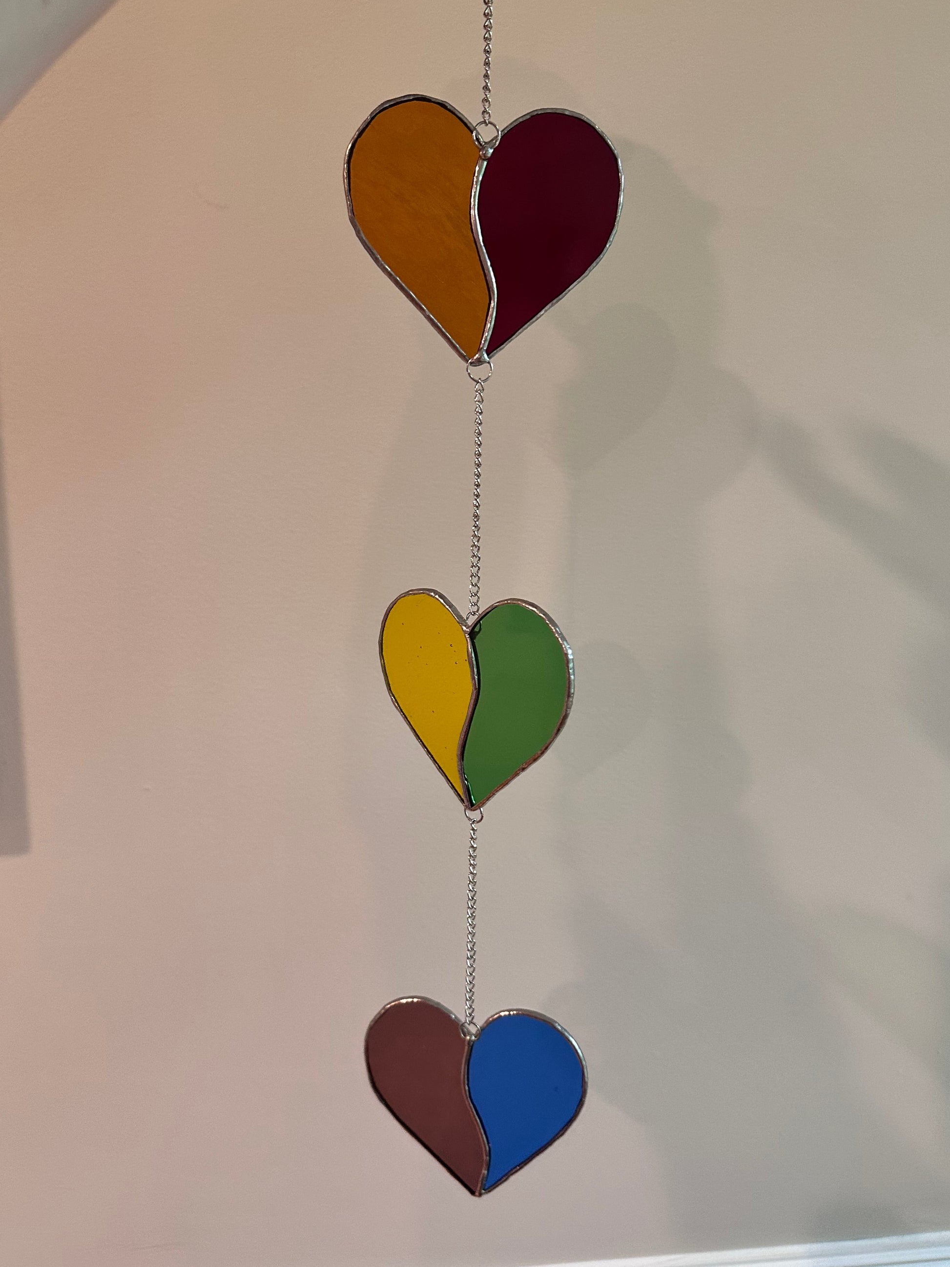 This hanging piece is made of three multi-colored hearts and measures approximately 24" long. Great for a simple but colorful window decoration!